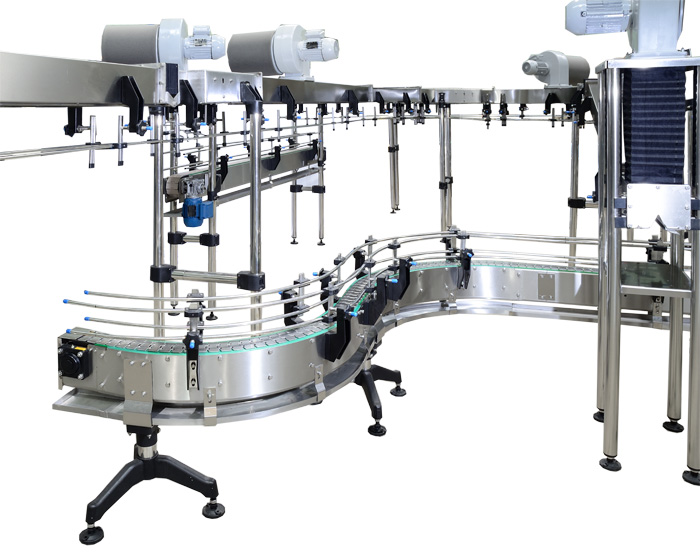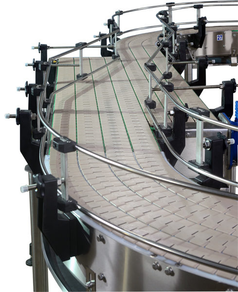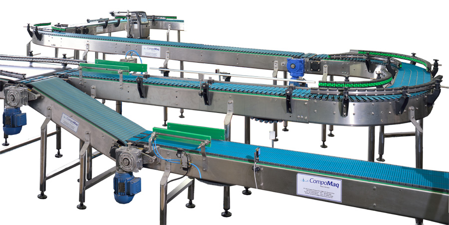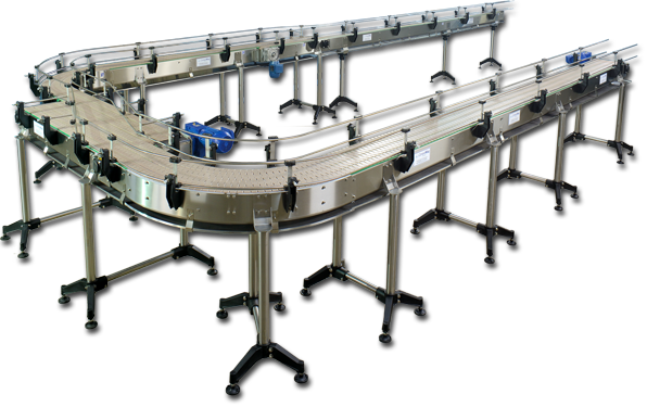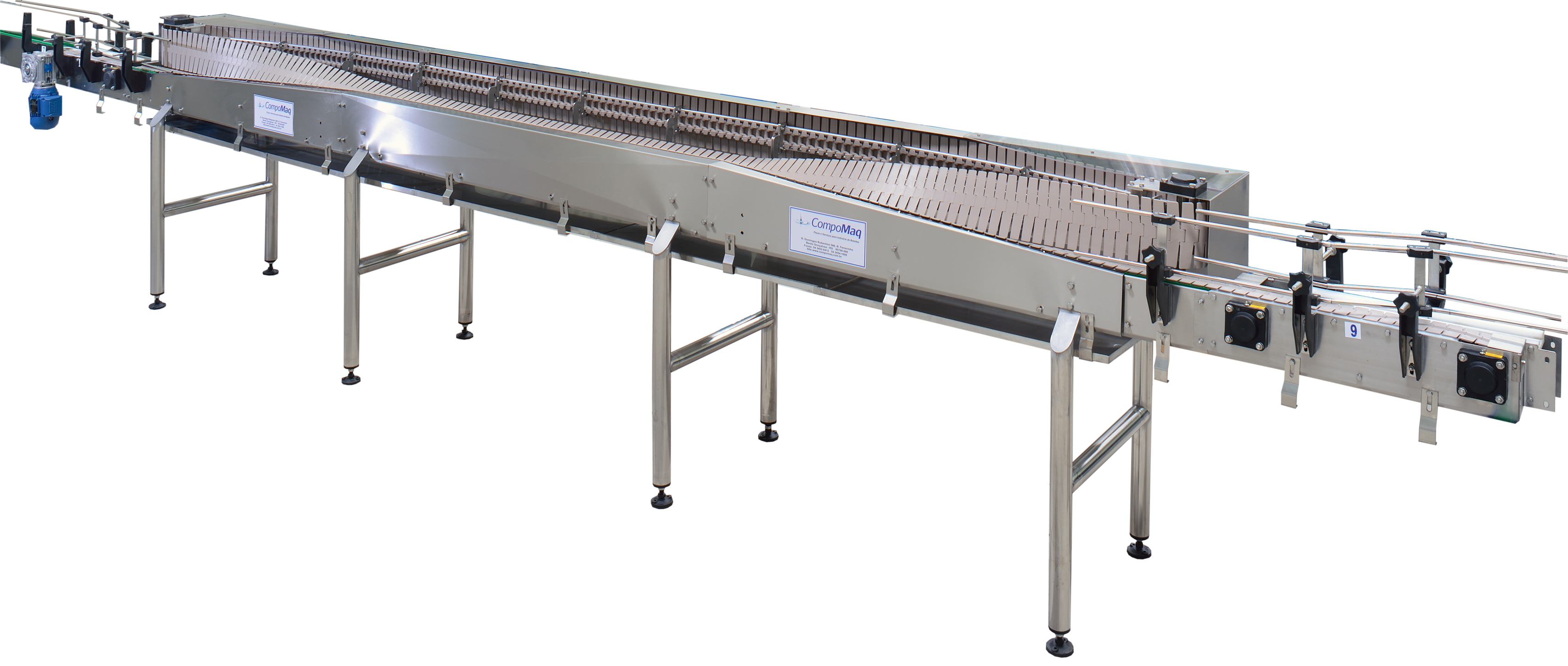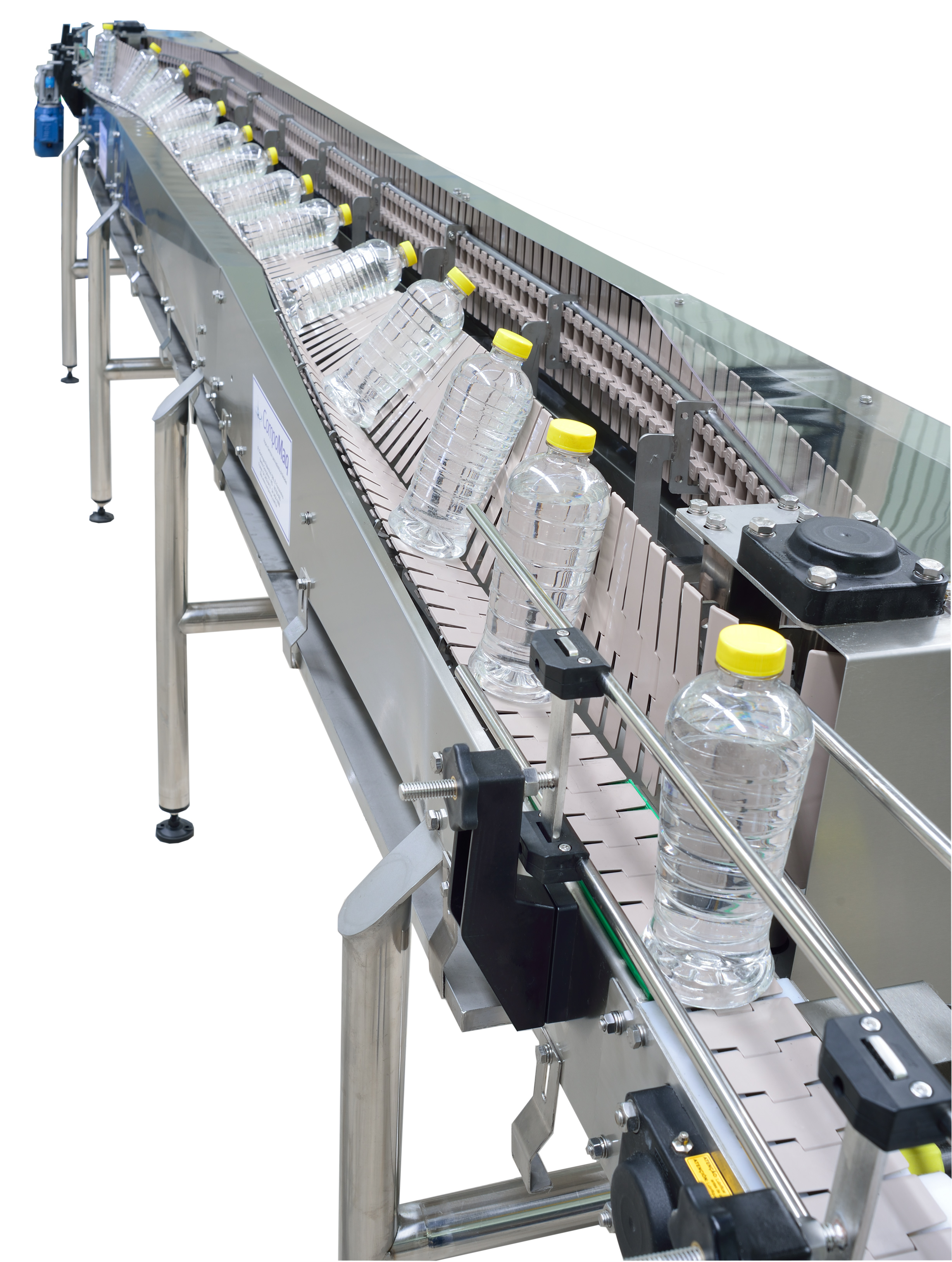 Nosso equipamento conta com guias deslizantes em polímero autolubrificante e pode utilizar correntes de poliacetal normal ou de baixo atrito, inox, lona e roletes dependendo da necessidade do cliente. O transportador é construído e apoiado sobre pés tubulares em aço inox com fusos niveladores
